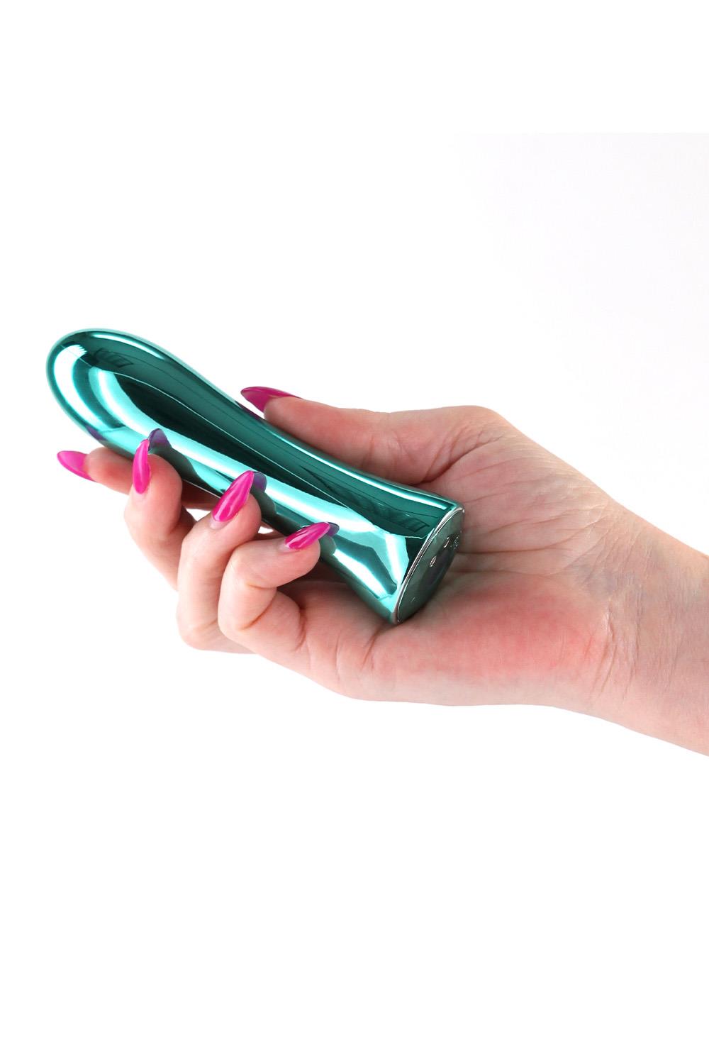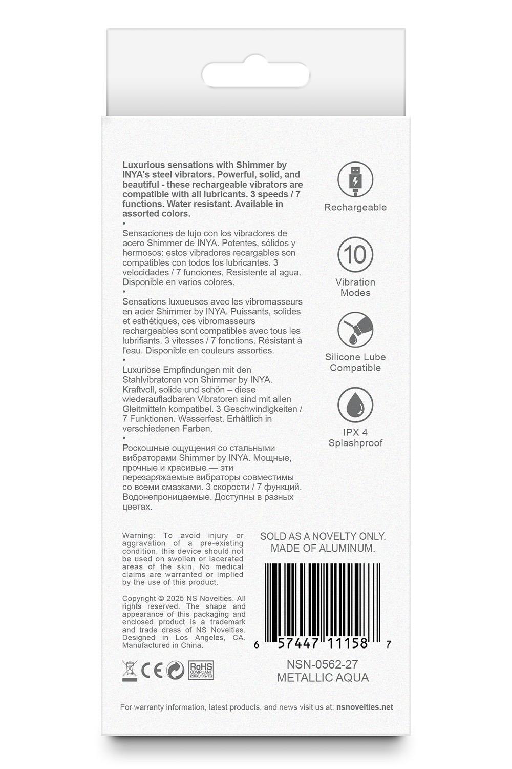 Мощ и стил от метал. NS Novelties Inya Shimmer Metallic Aqua е проектиран за тези, които търсят интензивна стимулация и ценят тежестта и стабилността на металните аксесоари. Тъй като е изработен от алуминиева сплав, той може лесно да бъде охлаждан или затоплян във вода, което ви позволява да експериментирате с температурна игра. Наситеният зелено-син аква цвят с металически блясък го превръща в истинско бижу за вашата колекция.