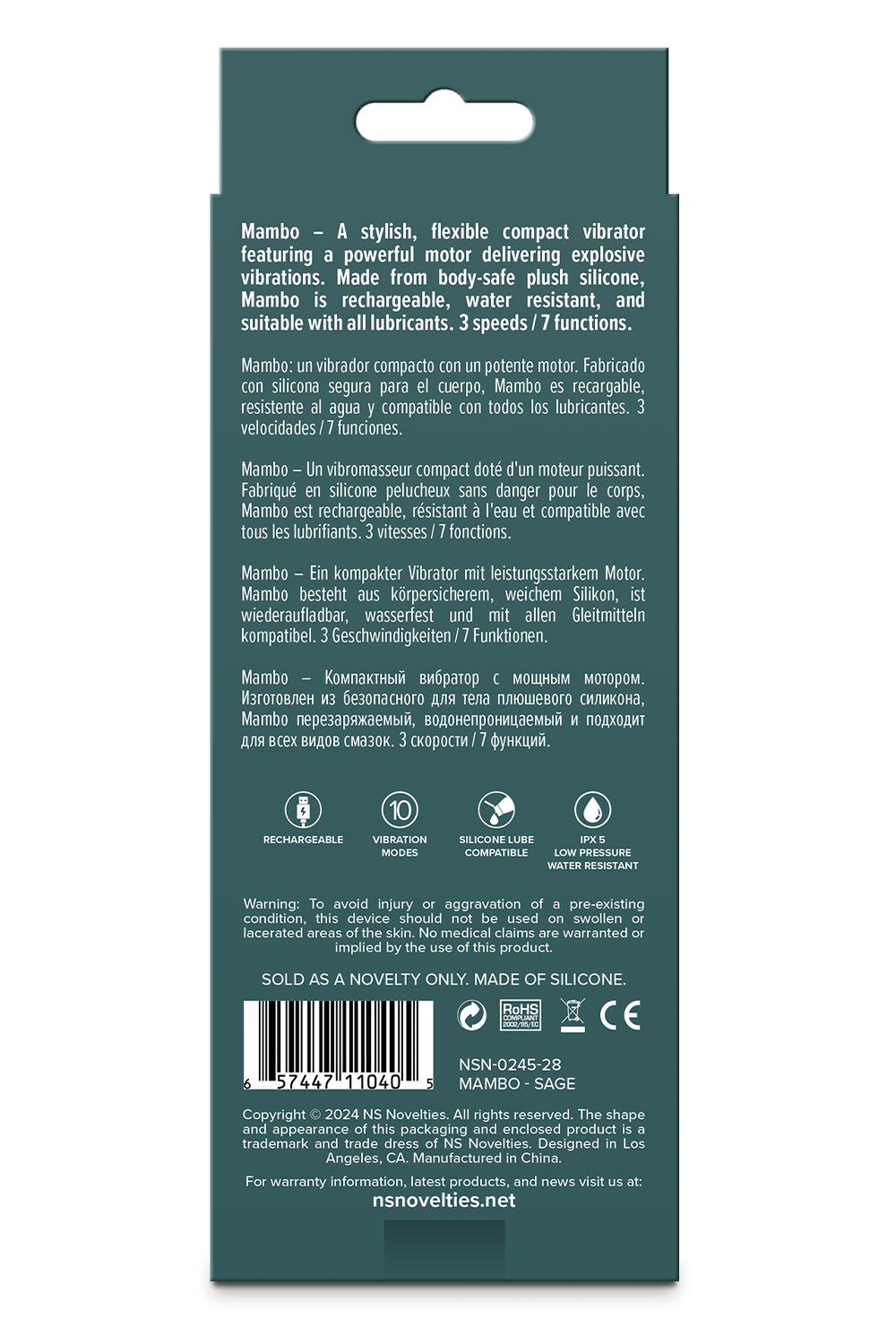 Кадифен силикон и пълна водоустойчивост. Изработен от първокласен, безопасен за тялото силикон, вибраторът е изключително нежен при допир. Mambo е водоустойчив, което позволява да му се наслаждавате под душа или във ваната, превръщайки рутината в релаксираща любовна игра. Устройството се зарежда бързо чрез USB-Pin кабел и е напълно съвместимо с всички видове лубриканти, гарантирайки гладко и безпроблемно плъзгане.